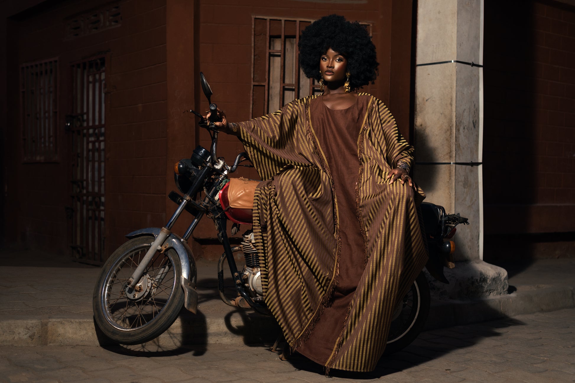 The Amina Beaded Boubou is a statement in quiet luxury. Crafted from a stunning blend of silk taffeta pinstripe fabric and soft cotton linen, this piece drapes effortlessly while holding structure and shape.